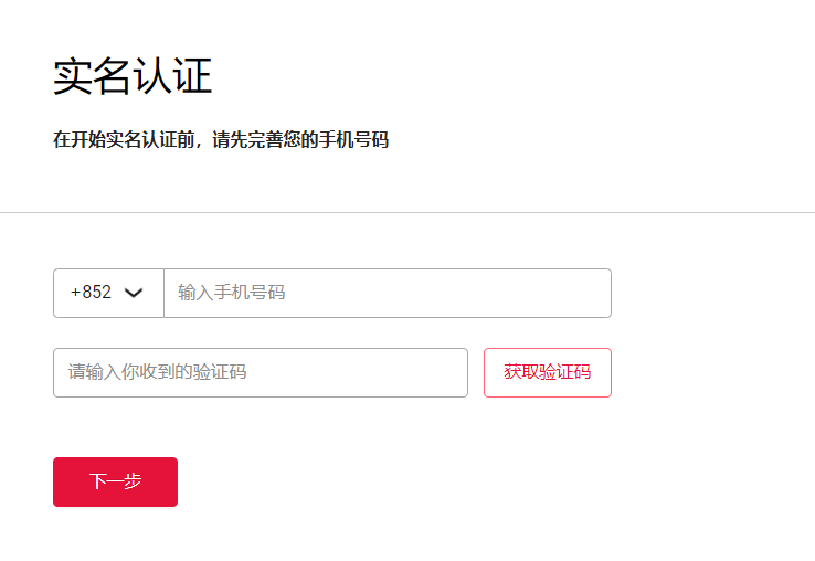 在开始实名认证前,请先完善您的手机号码,输入手机号码,后获取验证码。