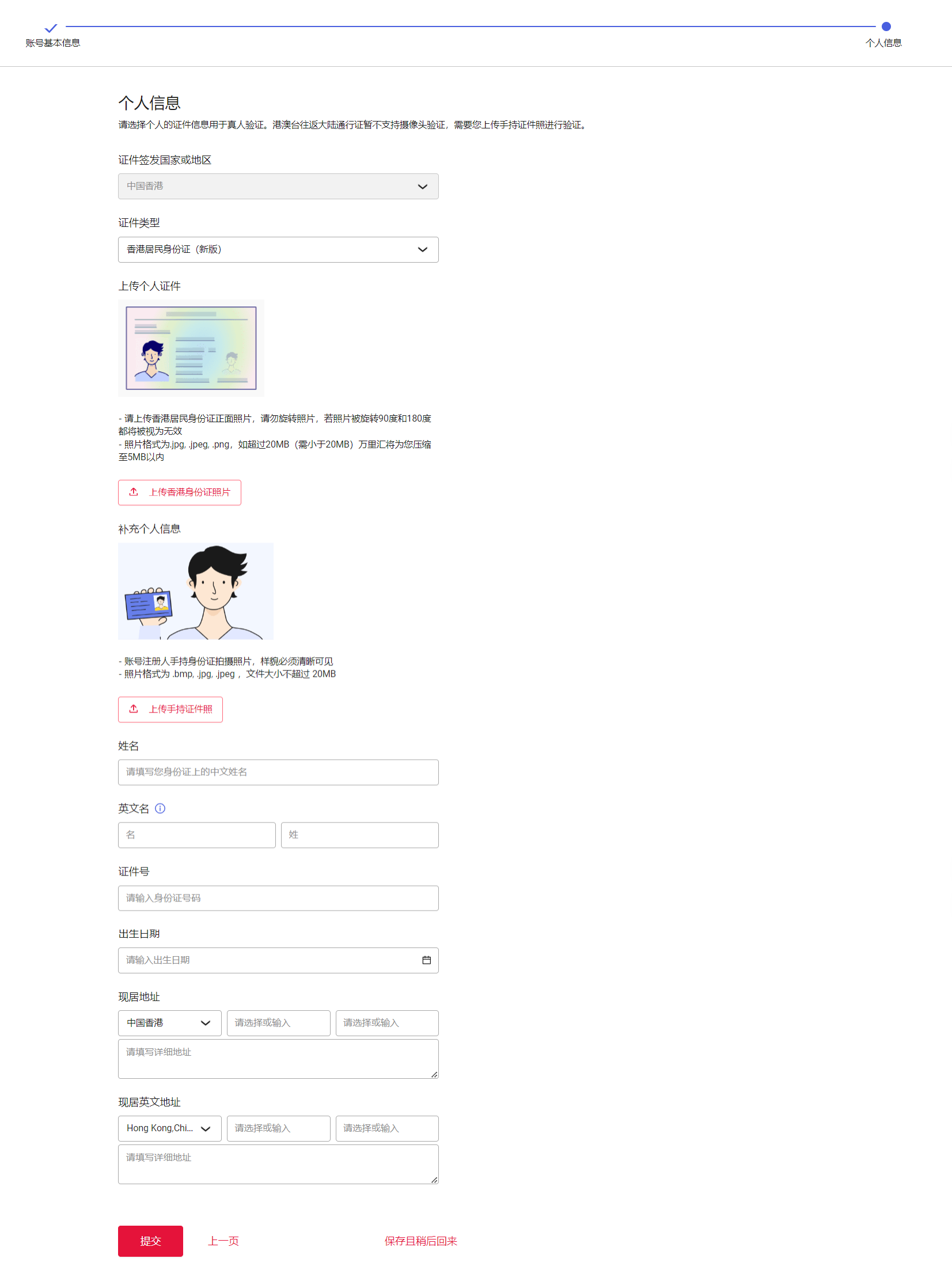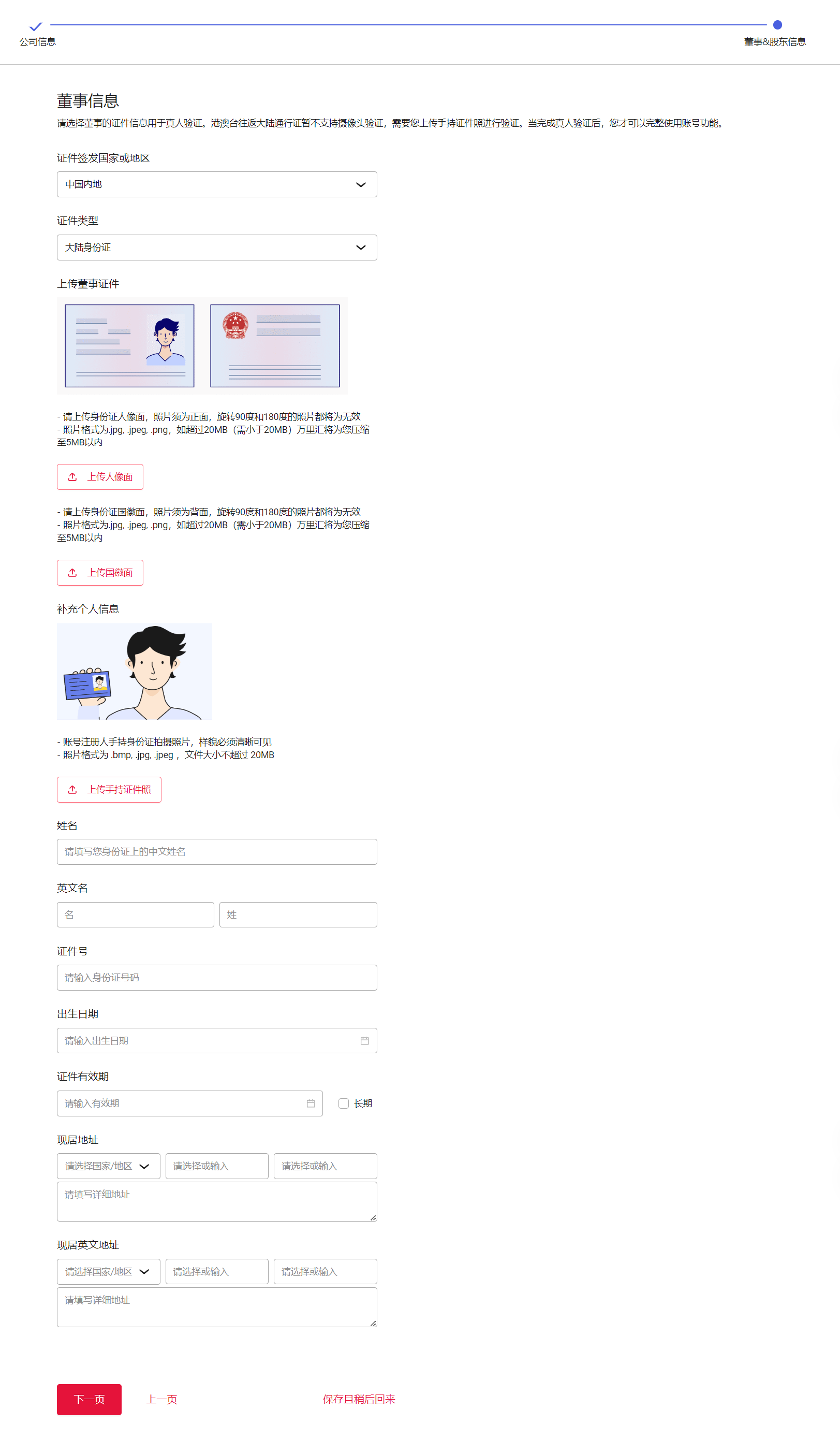 请选择董事证件签发国家或地区,选择正确的证件类型(证件类型支持新、旧香港居民身份证;护照;身份证);请您在补充个人信息处上传手持证件照,证件照要求为账号注册人一手持身份证,相貌必须清晰可见。上传证件后系统会对证件进行扫描,请您核对证件信息是否正确。