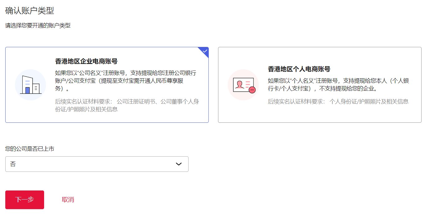 请选择账号类型为【香港地区企业电商账号】,并选择公司是否上市。如果已上市需要填写您的公司上市所在地区/国家。