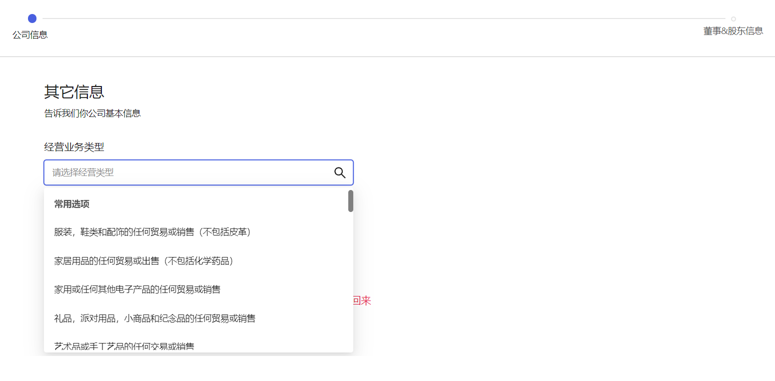 经营业务类型:可点击下拉列表,选择符合(最接近)您当前经营的业务类型;希望提款到的国家/地区可点击下拉列表,也可手动输入国家/地区名称选择(可多选)。