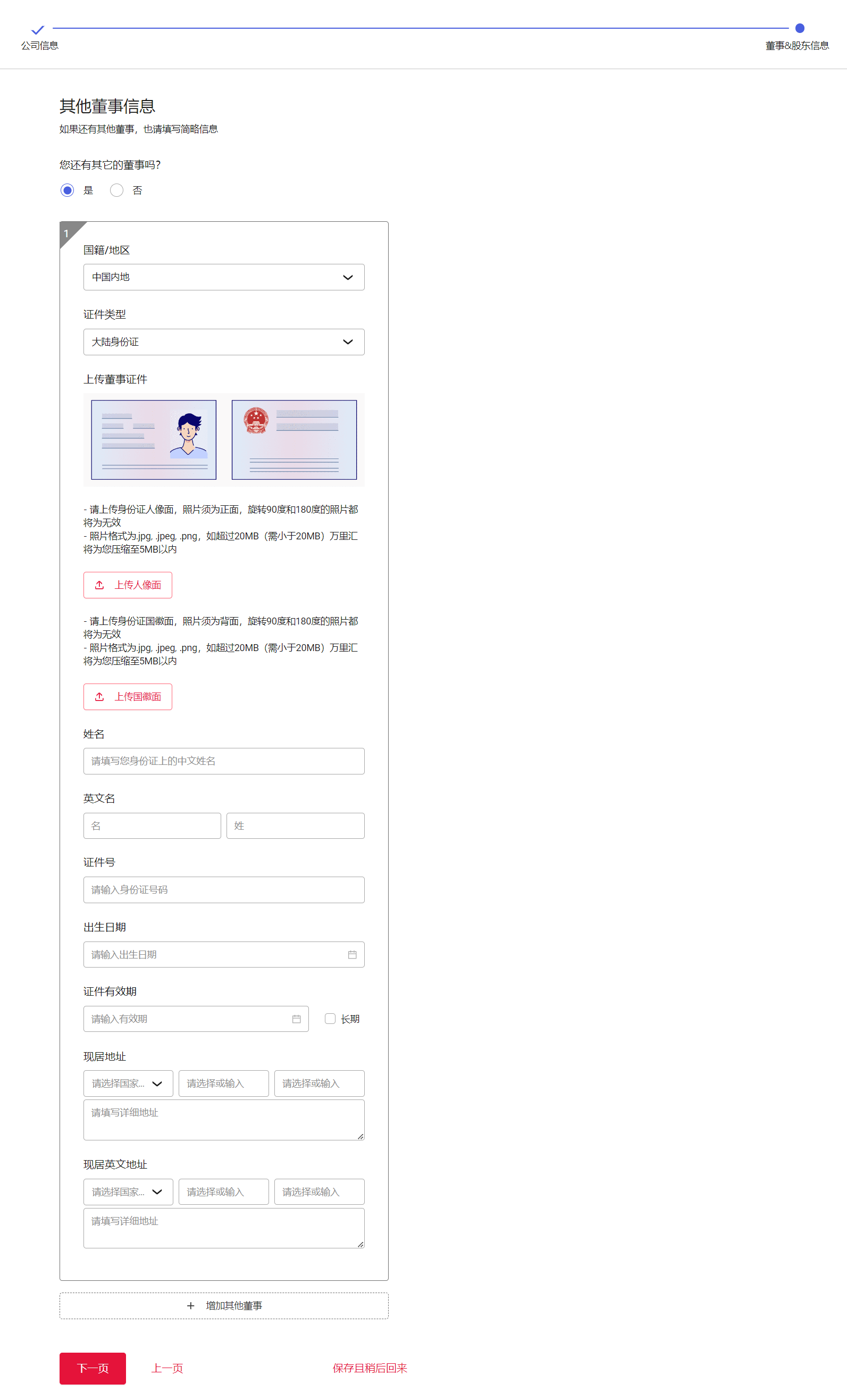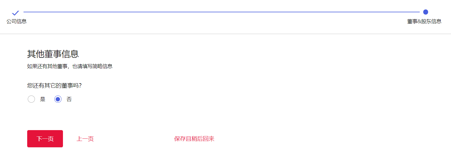 您需要填写公司的所有董事信息,如果没有其他的董事,请您点击【保存&下一页】继续下一步操作。