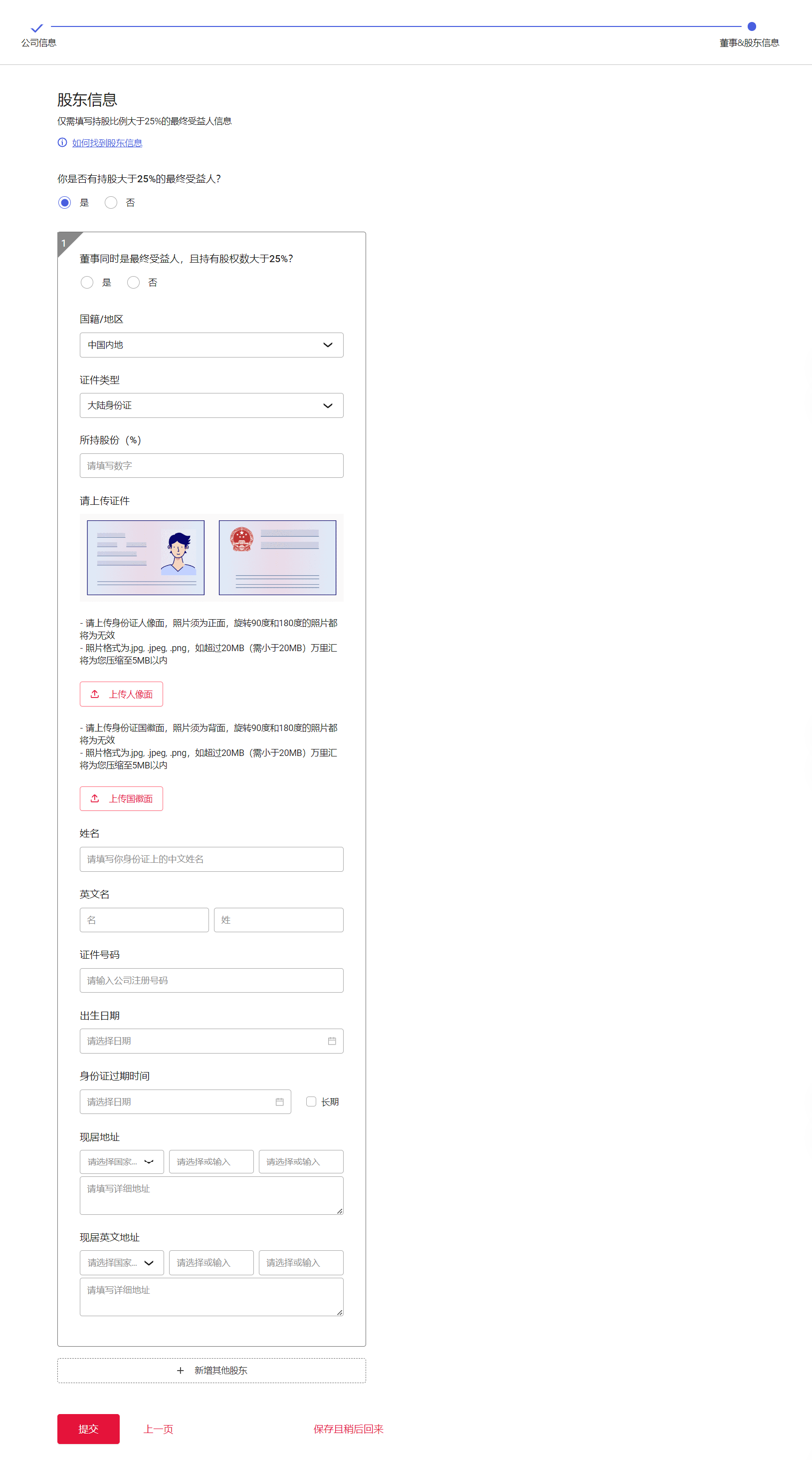 - 您是否有持股大于 25% 的最终受益人?如果贵司没有股权超过 25% 的持股人,则无需填写股东信息,可直接点击提交