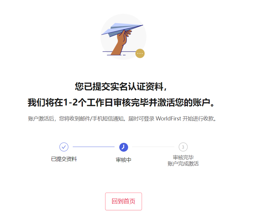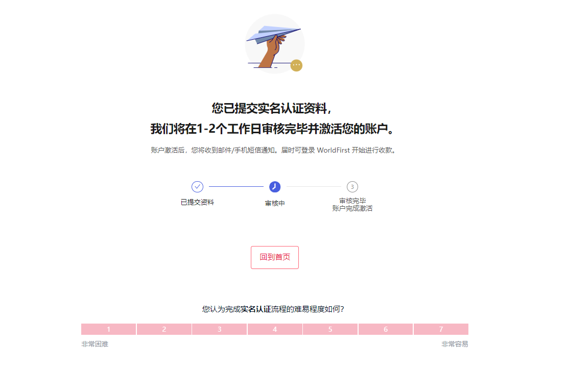 请您在最后一步检查全部待提交资料并点击【提交】即可完成认证信息填写环节,等待审核通过后即可正式使用万里汇(WorldFirst)跨境电商账号的产品功能。