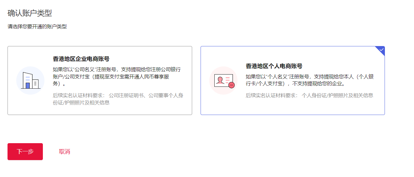 请选择账号类型为【香港地区企业电商账号】,并选择公司是否上市。如果已上市需要填写您的公司上市所在地区/国家。