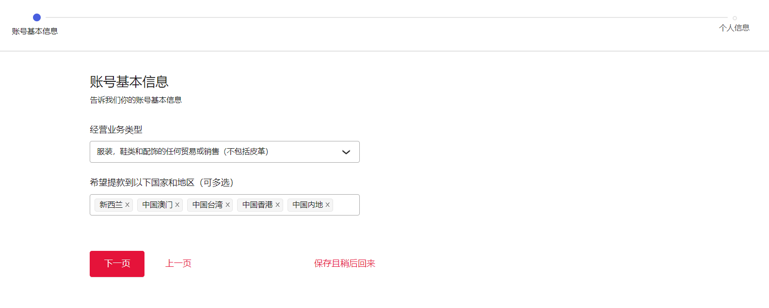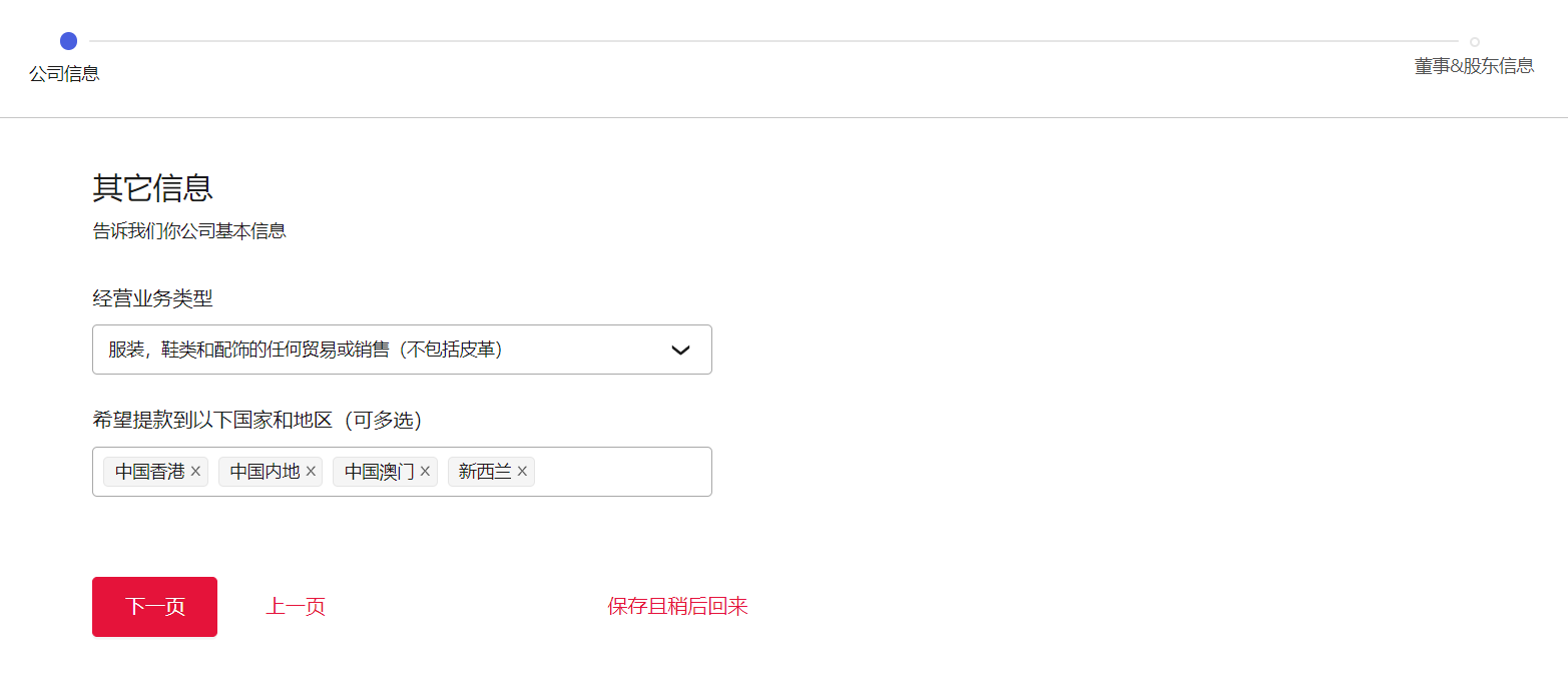 经营业务类型:可点击下拉列表,选择符合(最接近)您当前经营的业务类型;希望提款到的国家/地区可点击下拉列表,也可手动输入国家/地区名称选择(可多选)。