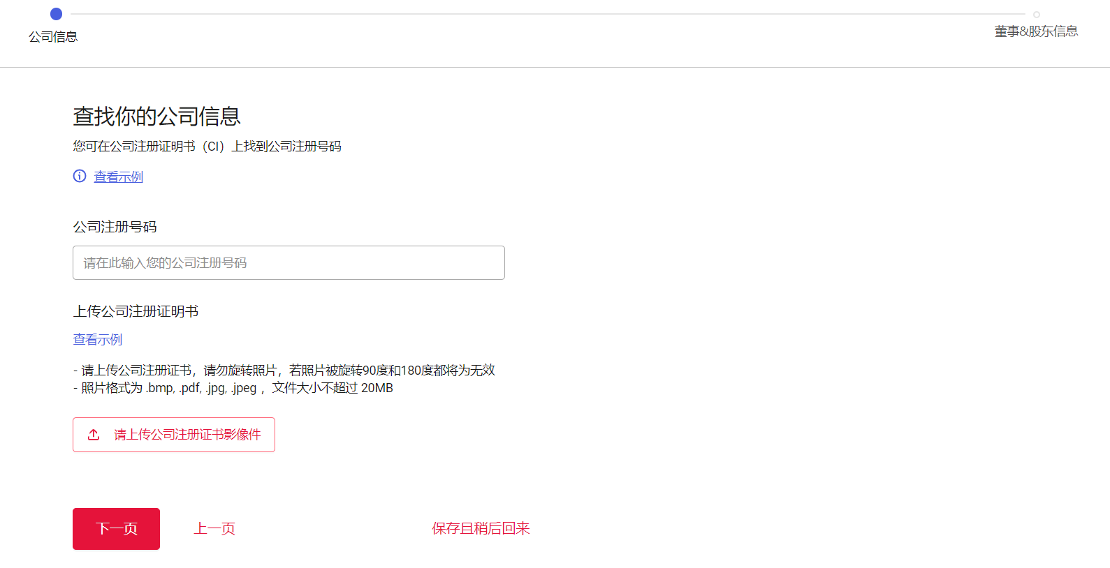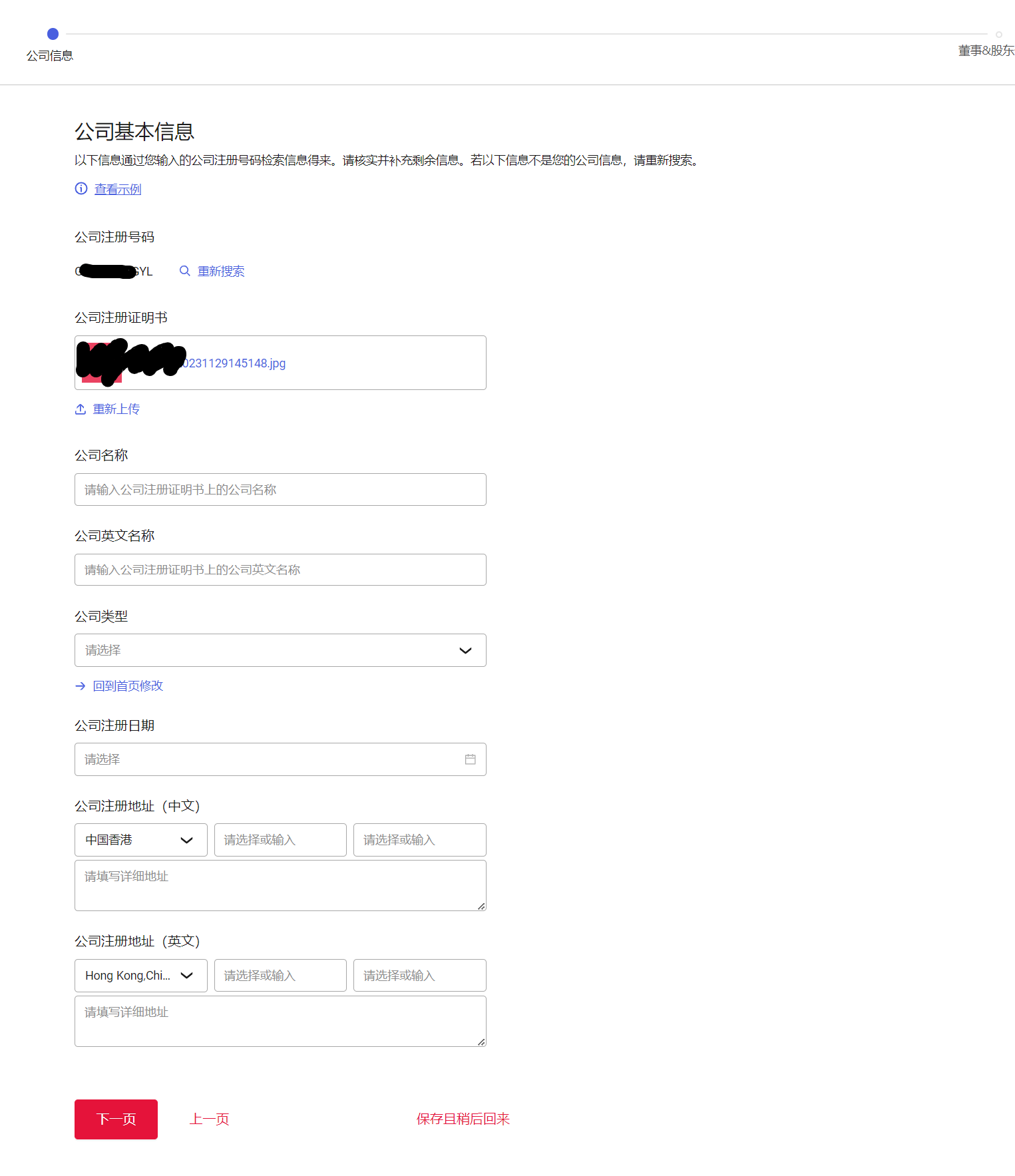 输入公司注册号码(通过公司注册号码,系统可以自动填写部分企业信息,客户可以核对或修改剩余信息。如果通过公司注册号码未能搜索到相关企业资料,您应检查输入是否正确。若无误,您可以忽略此提示,并手动填写)